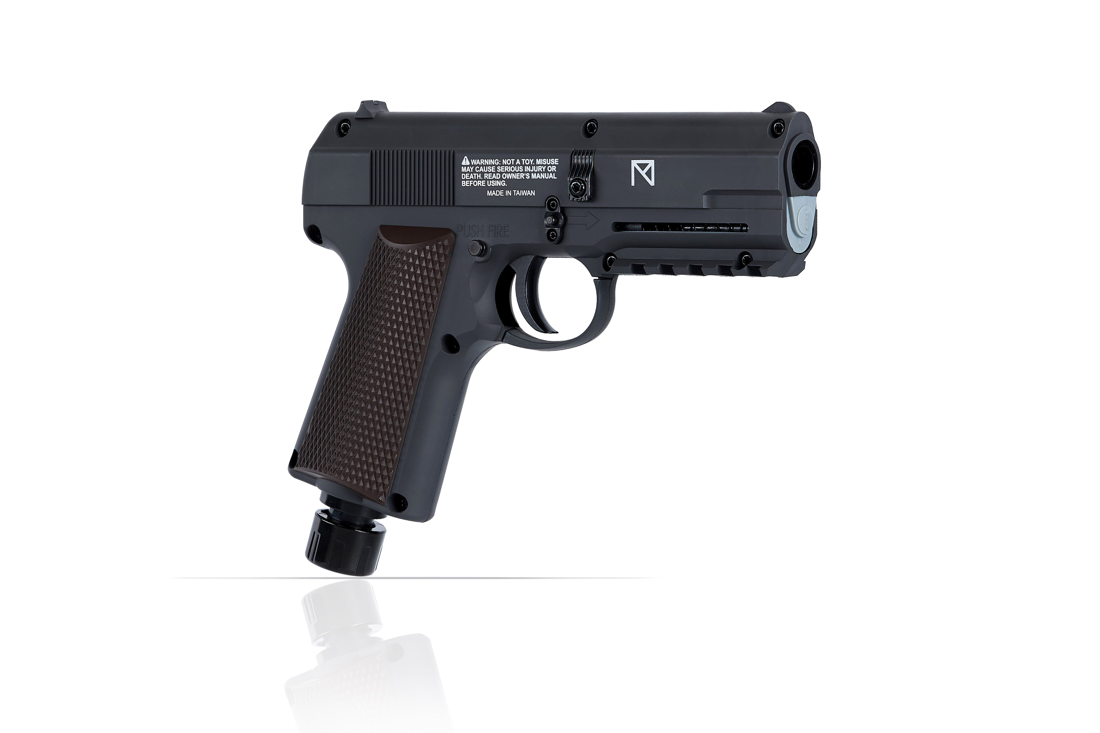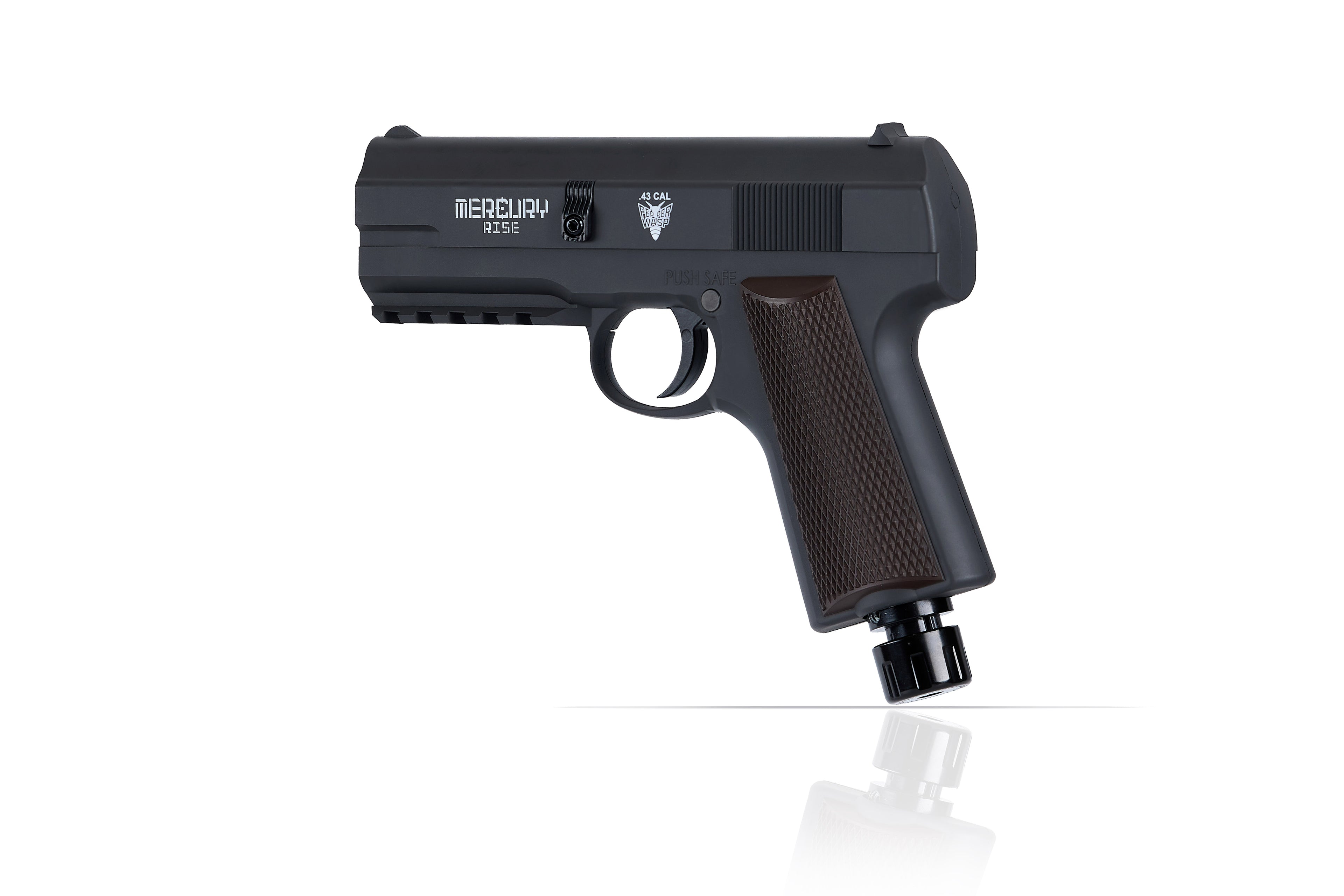 The Pepper Wasp .43 cal Paintball Pistol is a .43 caliber paintball pistol (shooting .43 Caliber Marking Balls, Pepper Balls, Rubber Steel Balls, Powder Balls, Rubber Balls as well) operating on 8g CO₂ cartridges (NOT included) located in the pistol grip. Featuring elegant styling with Picatinny rail for mounting a flashlight, laser or red dot sight. This pistol is made from high impact polymer and equipped with a 4-round magazine and a quick piercing cap. Loading & Unloading magazine under barrel. The magazine holds four (4) .43 caliber rounds and shoots from 280–370 FPS. Press the Quick Piercing Cap with your palm to pierce the CO₂ cartridge when you are ready to shoot. Extra one PW43 magazines is included in the product box.